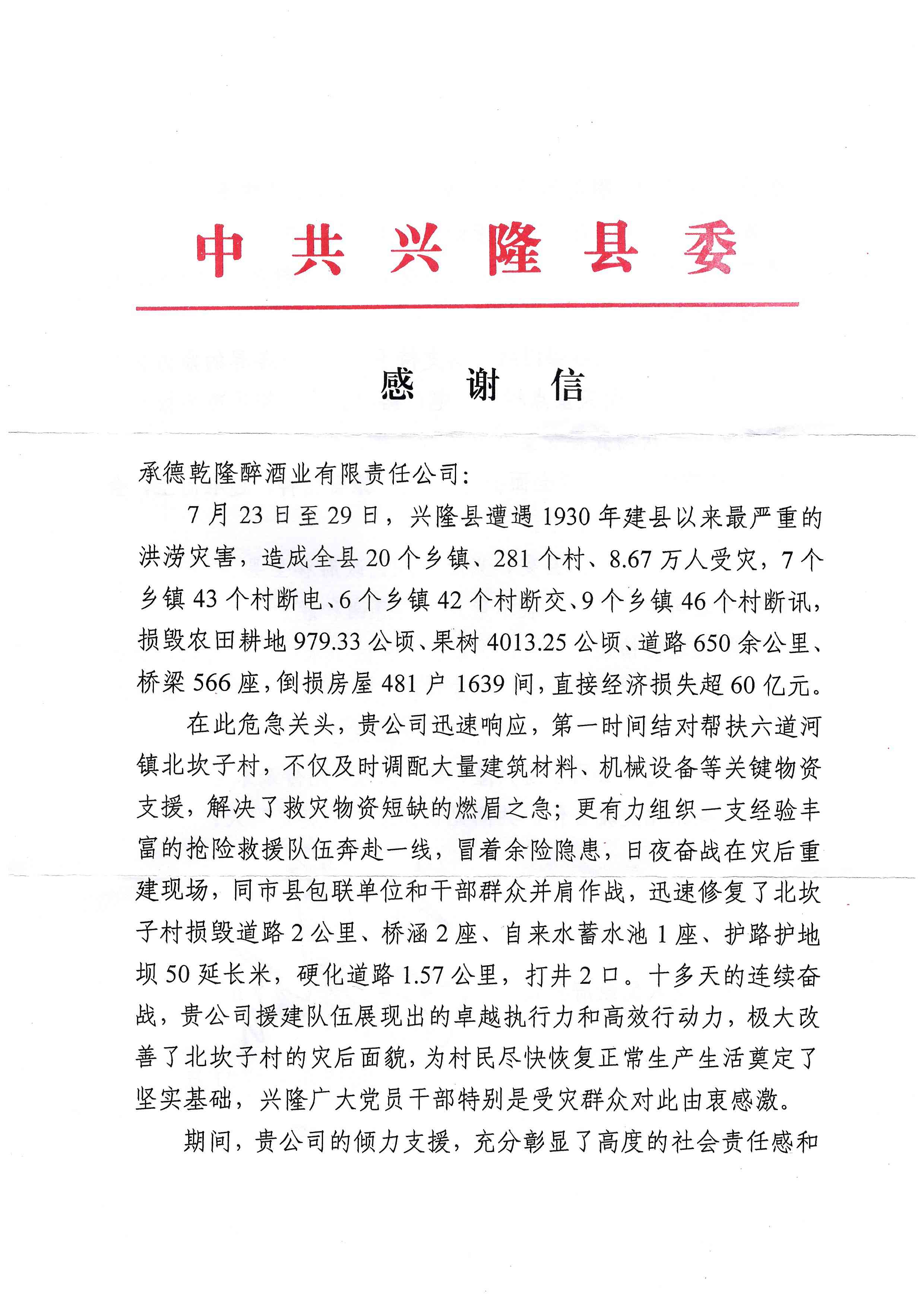 近日,板城酒業(yè)(承德乾隆醉酒業(yè)有限責任公司)收到中共興隆縣委發(fā)出的感謝信,信中對板城酒業(yè)在今年7月興隆縣特大洪澇災害中的緊急馳援和傾力相助表示高度贊譽和衷心感謝。