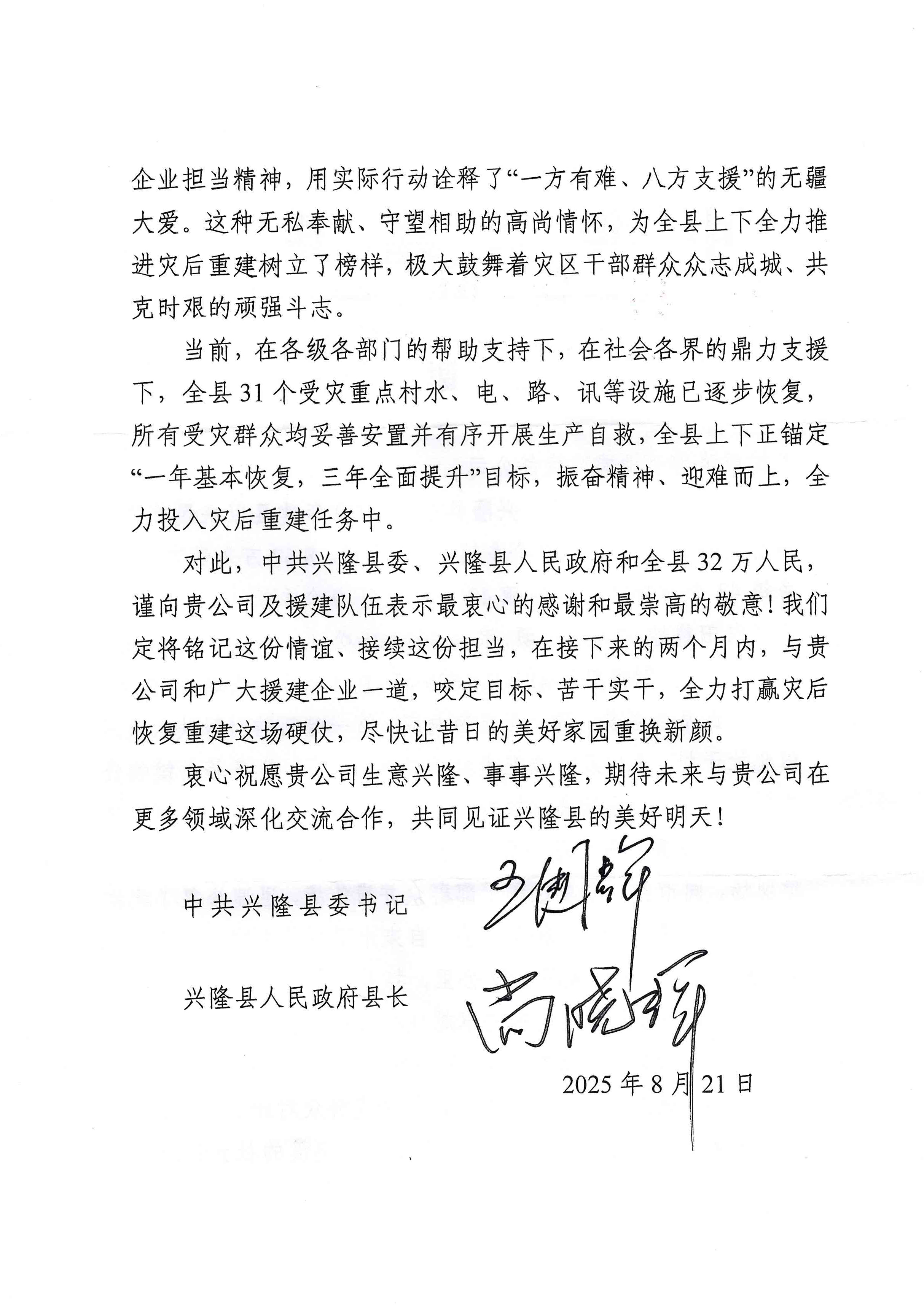 一直以來,板城酒業(yè)積極投身社會公益事業(yè),始終秉持“服務社會、回報社會”的企業(yè)宗旨。此次興隆縣的感謝信,再次體現了板城酒業(yè)在社會責任踐行方面的持續(xù)擔當。未來,板城酒業(yè)將繼續(xù)秉持企業(yè)擔當精神,在助力地方發(fā)展、參與社會公益等方面持續(xù)發(fā)力,為社會創(chuàng)造更多價值,也期待興隆縣在各方支援下早日重煥生機,共同邁向美好明天。
