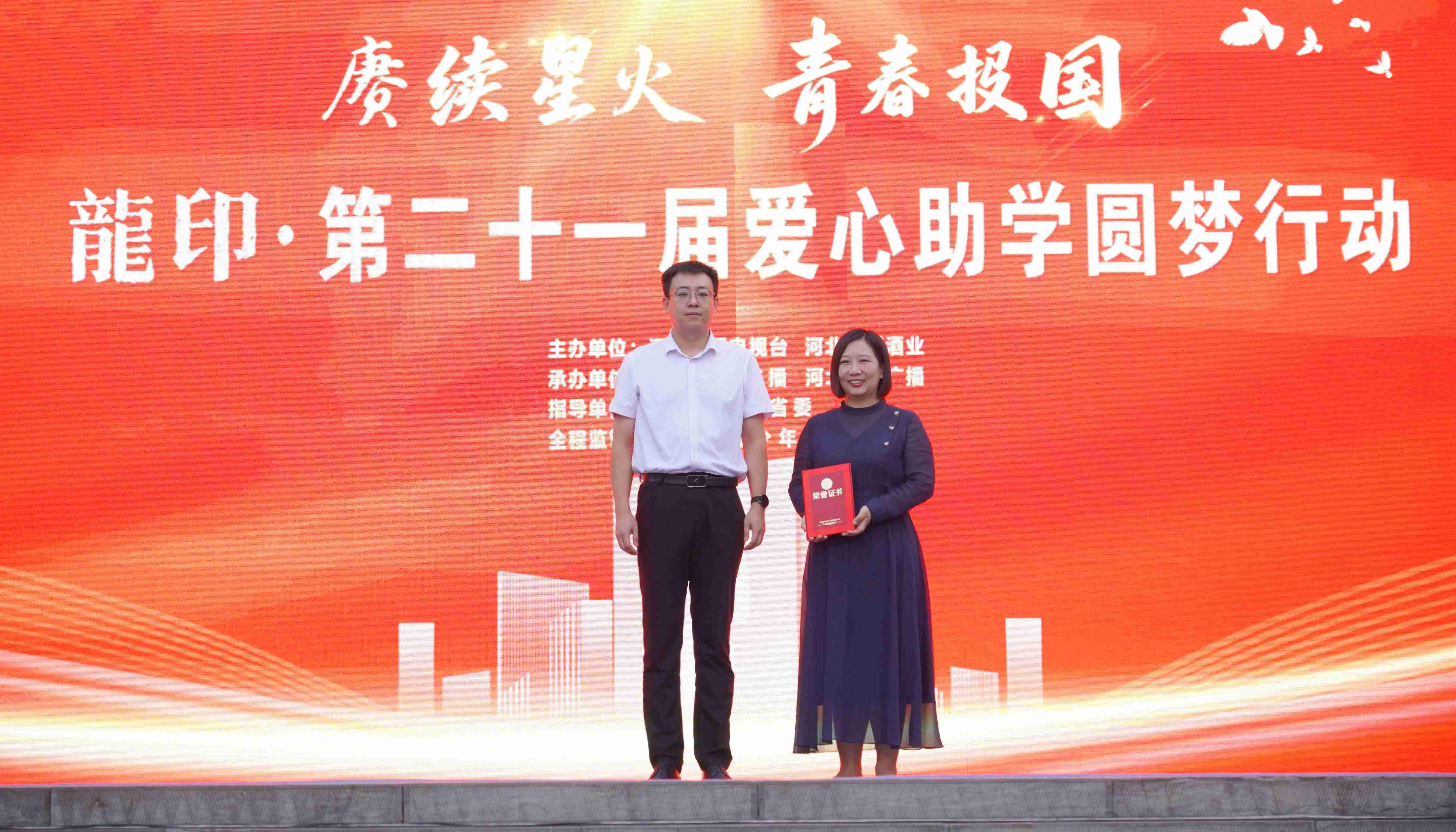 河北廣播電視臺副總編輯邊宇峰、板城酒業(yè)銷售市場總監(jiān)王曉波登臺為學(xué)子頒發(fā)助學(xué)金。